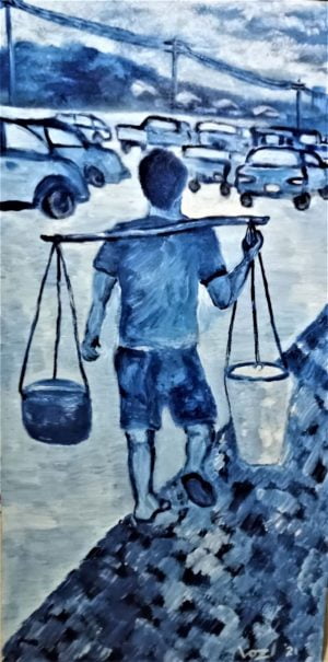 This painting is a figure study of a woman’s back. Painted in blue and white enamel paints on plywood. 2 ft (L) x 1 ft (W)