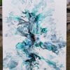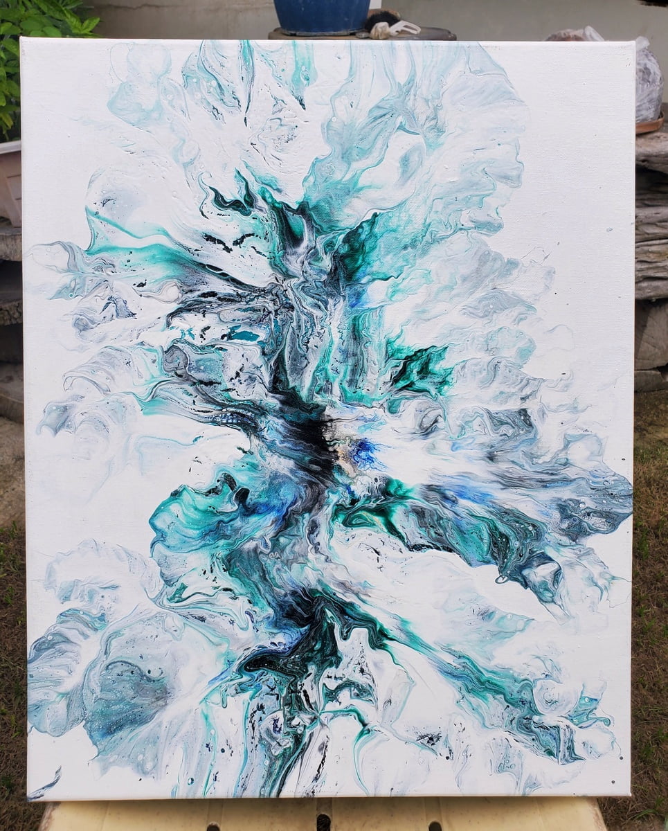 An acrylic pour painting in a 16×20 inches stretched canvas. This is an abstract painting using acrylic flow technique and shows an image of what seems like a green sorceress doing its magic. The main color of the painting is phthalo green with a mix of black, blue and gold. The painting is finished with clear acrylic varnish and signed at the back.