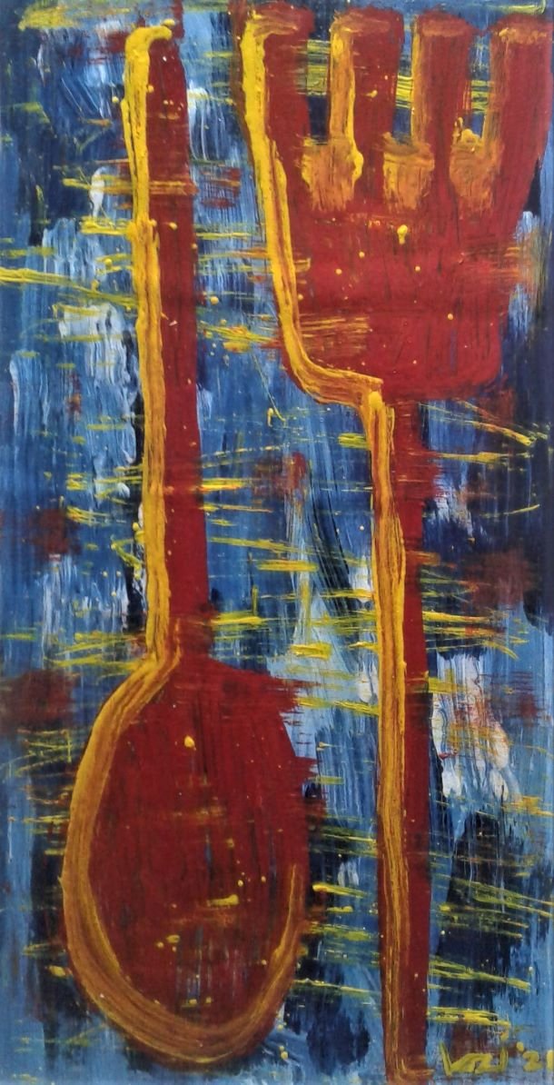 A big spoon and fork can be typically seen in a Filipino home. This painting pays homage to that uniquely Pinoy detail of a home’s dining room.