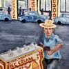 An ice cream vendor pushes his heavy cart to go to a nearby park where, hopefully, kids will buy their favorite sorbetes. Painted on plywood with enamel paints. Size 4ft(L) x 2ft(W).